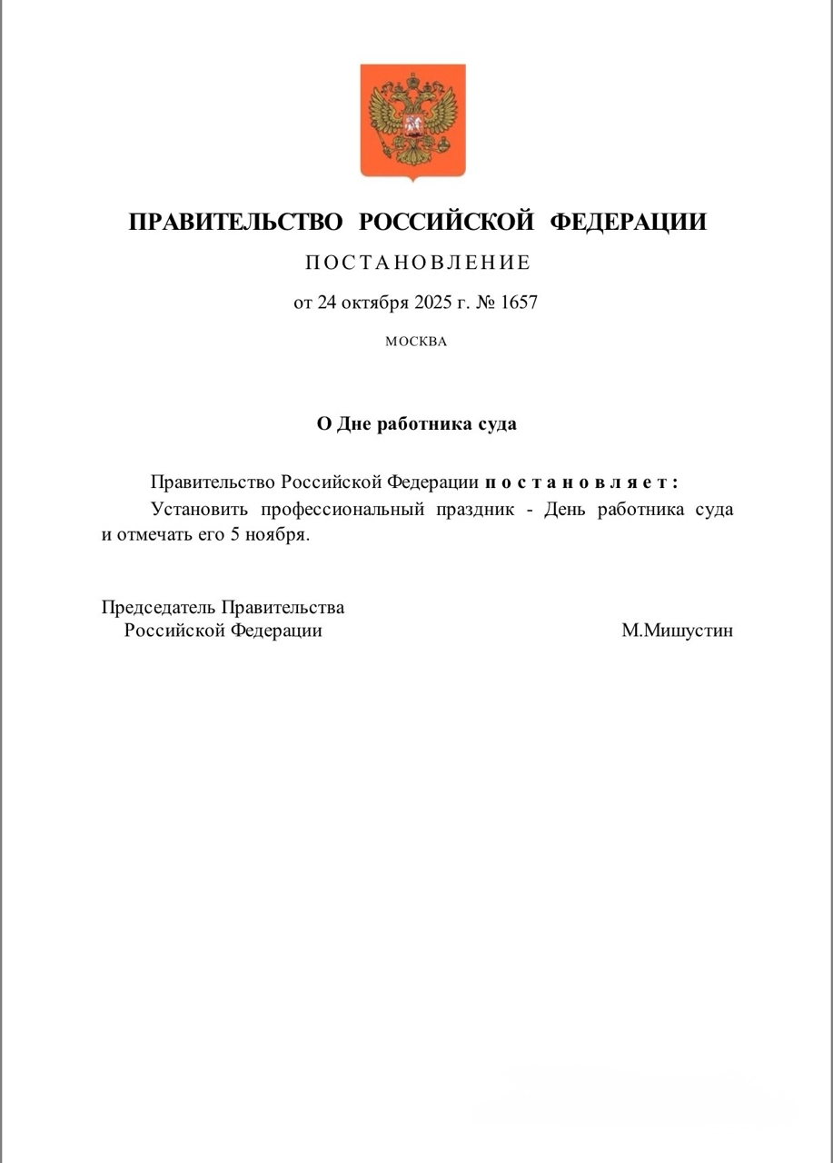 ![]() Постановление об установлении профессионального праздника - День работника суда Постановлением Правительства Российской Федерации от 24 октября 2025 года № 1657 установлен новый профессиональный праздник - День работника суда. Этот праздник будет отмечаться ежегодно 5 ноября. Празднование приурочено к дате издания указа Императора Всероссийского Петра I «О форме суда». |